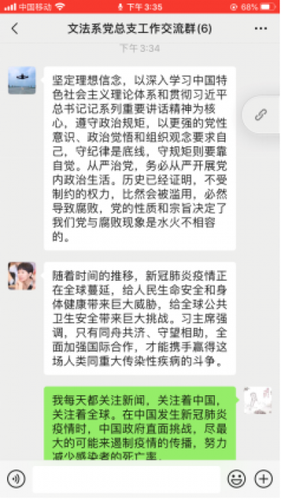会初,李旸老师带领全体成员学习习近平总书记《团结合作是国际社会战胜疫情最有力武器》重要文件精神,并学习《党委(党组)落实全面从严治党主体责任规定》。参会人员在学习完理论知识后依次发表各自的心得体会,其中,霍佳静老师提出,从严治党离不开一个“责”字,党员干部应认真落实中央关于从严治党的新要求,深入贯彻落实习近平总书记系列重要讲话精神,坚持"三严三实",做信念坚定,为民服务、勤政务实、担当、清正廉洁”的好党员。会议最后,李旸老师提出,疫情防控仍未结束,仍需认真贯彻落实学院党委关于疫情防控的工作部署,保证系部日常防疫工作有条不紊的进行。