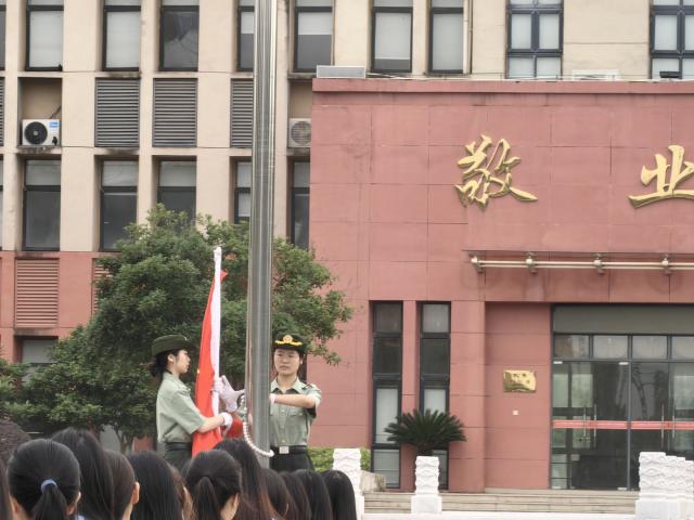 随着第一缕阳光出现,步入场地的是国旗护卫队,她们迈着稳健的步伐,目视前方,身姿挺拔,护送五星红旗入场,全场的师生面向国旗肃目行礼。随着激动人心的《义勇军进行曲》响起,鲜艳的五星红旗随着全场师生炙热的目光缓缓升起,随风猎猎作响。