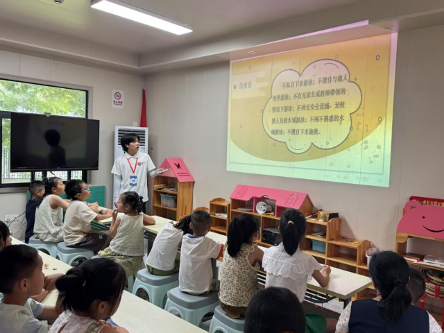 随后,践行团成员施振楠开展防溺水安全宣讲。通过播放动画视频、展示图片案例,以通俗易懂的语言向小朋友们讲解溺水的危害、危险水域的识别,以及如何正确预防溺水和在遇到危险时的自救与施救方法。为确保小朋友们真正掌握知识,还设置了跟读环节,小朋友们积极参与,大声朗读,现场气氛热烈。此次宣讲有效增强了小朋友们的防溺水安全意识,为他们的暑期安全筑牢防线。