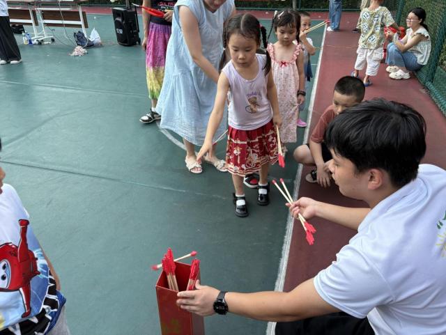 活动现场,欢呼声、加油声此起彼伏。运动会精心设置了多个趣味十足的项目,既有考验团队协作的“两人三足接力赛”,也有充满技巧挑战的“投壶”“套圈大比拼” ,还有活力四射的“跳绳接龙”。“投壶”大比拼环节,大家排着队,屏气凝神,小心翼翼地抛出手中的箭,都希望能投进壶里,赢得奖品。每一个项目都让小朋友们沉浸其中,现场气氛热烈而欢快。践行团成员们还贴心地为孩子们准备了小零食、气球、红旗等奖品,让孩子们在收获快乐的同时,也能得到一份小小的惊喜。