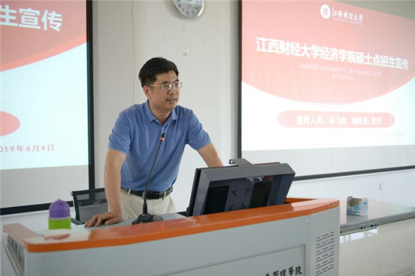 杨飞虎教授首先对学校和学院的情况进行了简单的介绍,之后就研究生的培养以及招生专业进行了详细的介绍,之后对考研的报名程序进行了指导并留下具体的咨询联系方式,最后表示热烈欢迎我院学生报考江西财经大学经济学院。