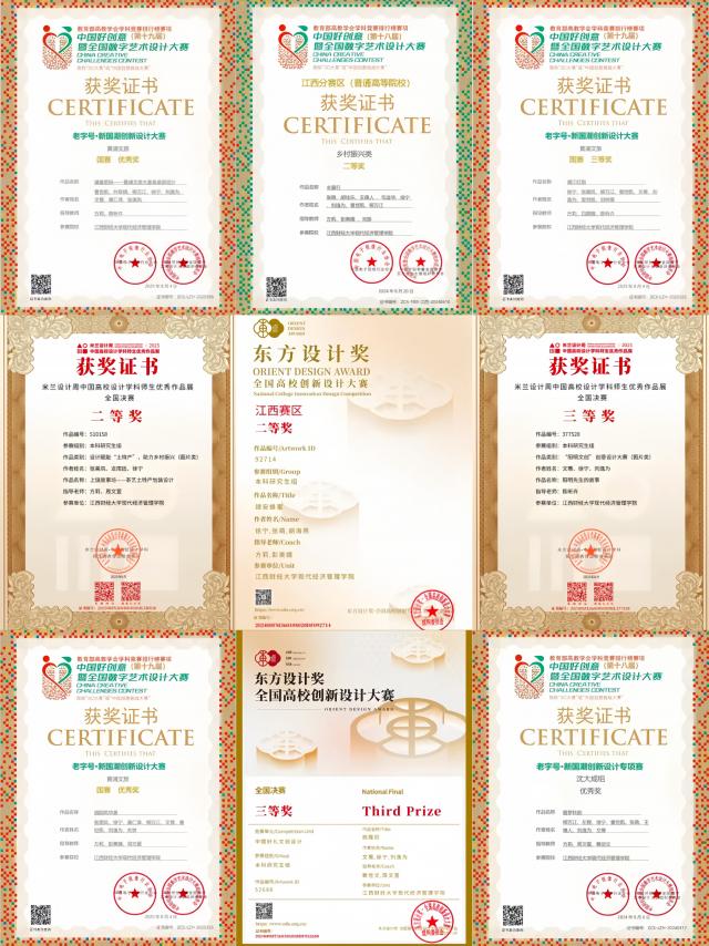 省级获奖经历:第十一届未来设计师大赛江西赛区一等奖、东方设计奖全国高校创新设计大赛江西赛区一等奖、2023年第六届大学生绿色会展创新创业挑战赛省二等奖、第十八届中国好创意江西赛区二等奖、井冈山红色文化创意产品设计大赛省级二等奖、2023年江西省大学生科技创新竞赛工业设计省级三等奖等。