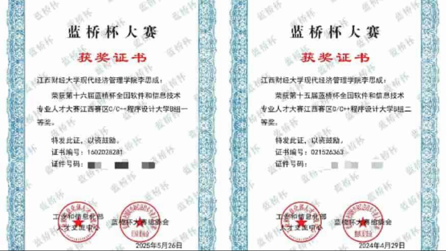 如果说企业模拟大赛是帮派混战,团队施展浑身解数抢地盘,那么蓝桥杯则是独行侠比武,参赛者凭自身绝学一较高下。时光回溯至2024年4月13日,黎明破晓,细雨如丝,江南被朦胧烟雨笼罩,恰似一幅水墨丹青。在学院的宿舍里,李思成轻手轻脚起身,准备前往南昌航空大学科技学院,参加第十五届蓝桥杯全国软件和信息技术人才大赛。这是他首次踏出校门,奔赴“战场”。简单洗漱后,李思成披上微皱的外套,背上装满资料的背包,怀揣勇气踏入雨幕。雨滴在青石板上溅起水花,他脚步轻快坚定,灰蒙的天空偶尔闪过几道光亮,雨点击打伞面的滴答声,宛如出征的战鼓,敲打着他的心房,让他对这场“江湖试炼”满怀期待与紧张。为了这场比赛,他独自开启了“百日大战”。每天清晨6点,阳光尚未照进宿舍,他已在书桌前,对着电脑屏幕敲击代码,一行又一行,不断优化、调试。难题如凶狠的“江湖恶匪”,但他从不退缩,独自查阅资料,向网络上的“武林高手”请教,常常钻研至深夜。 抵达南昌航空大学科技学院,校园里已有不少参赛学生,大家神色匆匆,有的还在抓紧复习。9点,比赛开始。他坐在电脑前,手指如灵动的剑客,在键盘上飞舞,双眼紧盯屏幕,不放过任何细节。时间飞逝,他额头冒出细密汗珠,心跳如鼓,感觉自己身处没有硝烟的战场,以代码为剑,与时间、难题殊死搏斗。下午1点,结束铃声响起,这场煎熬的持久战终于结束了。他成功斩获第十五届蓝桥杯全国软件和信息技术人才大赛江西赛区二等奖。得知喜讯的那一刻,他眼中闪烁着光芒,那是过往百日的孤独与汗水化作的自豪与满足。