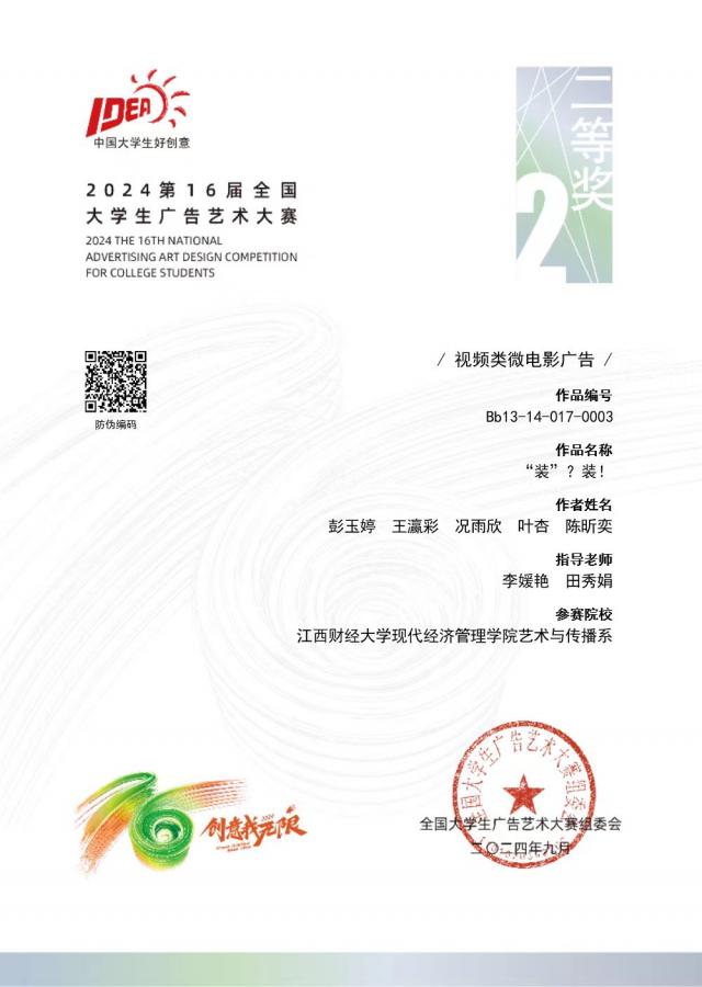 《装?装!》斩获2024年第十六届“大广赛”全国二等奖,她们意志如钢,勇克重重难关,无惧风雨侵扰,毅然奋勇向前,将专业知识化为实践的羽翼,奋力拼搏进取,终铸辉煌成就,她们是来自设计与传播学院22级的学子彭玉婷、王瀛彩、况雨欣、叶杏、陈昕奕。