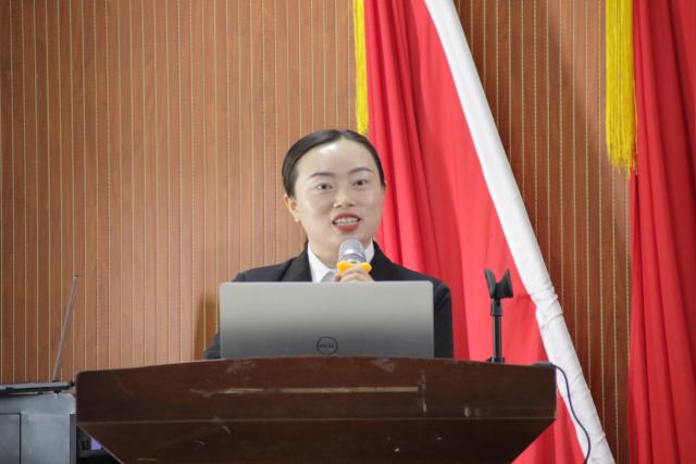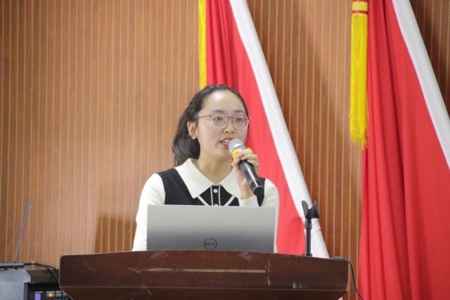 符洁以《汲取发展力量,共赴青春征程》为题,开启了本场活动的精彩篇章。她首先抛出问题:若用一个词来描绘“十四五”规划这五年,你会想到什么?随后,她将视角聚焦于民生领域,结合“十四五”规划期间的民生改善实例,生动展现了国家发展如何润泽千家万户;她还围绕绿色发展理念,通过各地生态治理、低碳转型的鲜活案例,阐释了生态文明建设与青年责任的紧密关联。她的讲解既有翔实的数据支撑,又有贴近生活的观察思考,让在场师生深刻感受到国家发展的脉搏与青年成长的方向同频共振。