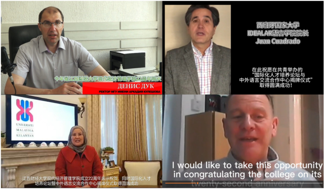 白俄罗斯莫吉廖夫国立大学校长杜克、马来西亚吉兰丹大学学术与国际副校长Ng Siew Feon、西班牙国立大学语言学院院长胡安Juan Cuadrado、波兰克拉科夫经济大学大卫 . 克劳斯教授线上连线发来视频祝贺。