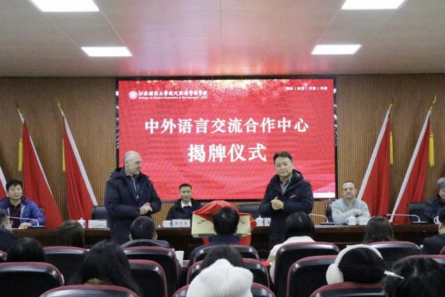 12月18日上午,由共青城市校地共建办、人才服务中心和江西财经大学现代经济管理学院主办,国际文化交流中心、经济学系承办,中国科协海智计划工作基地(九江国际人才创业社区)协办的“国际化人才培养论坛暨中外语言交流合作中心揭牌仪式”在我院举行。共青城市委常委、副市长、校地共建办主任胡胃东,白俄罗斯莫吉廖夫国立大学法学院院长布拉科夫.维克多.尼古拉耶维奇,白俄罗斯莫吉廖夫国立大学教育学院副院长谢尔盖.维克托罗维奇.斯皮林,江西省科学院产业技术研究院副院长刘炜、江西省科学院孵化中心科技服务经理王小军莅临仪式。学院院长王金海,党委副书记邱晓平,副院长吴小刚、副院长陆宇海、纪委书记朱晓丽出席仪式。活动由国际文化交流中心主任纪奥主持。
