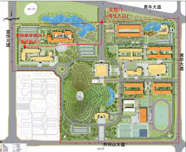 2.因校园外道路施工,所有考生车辆可停放在求知教学楼(考试地点)北门停车场,为维护校园秩序,请考生按校内规定路线行驶。