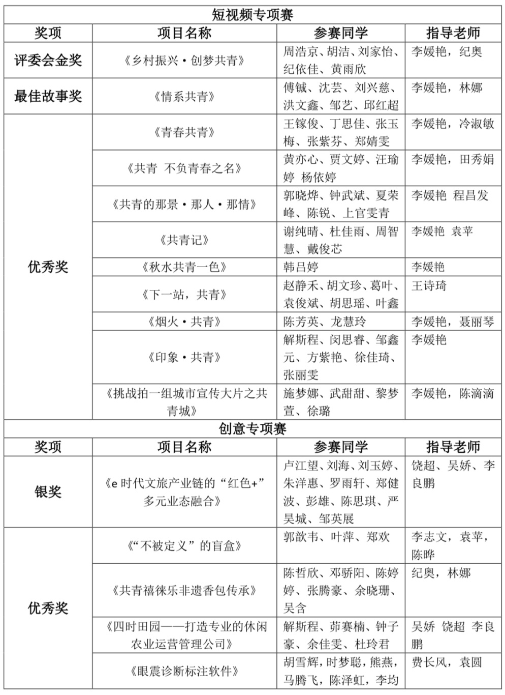 在学院领导的大力支持和创新创业中心精心组织下,艺术与传播系新闻学专业11支队伍,突出重围进入短视频专项决赛。在新闻学教研室主任李媛艳细心指导决赛队伍进行路演与答辩演练后,11支队伍沉着应赛,通过PPT、视频演示等方式答辩,最终《乡村振兴,创梦共青》荣获评委会金奖;《情系共青》荣获最佳故事奖;《共青 不负青春之名》、《秋水共青一色》、《共青的那景·那人·那情》等获得优秀奖,全面展示我院学生的综合素质和创新能力。