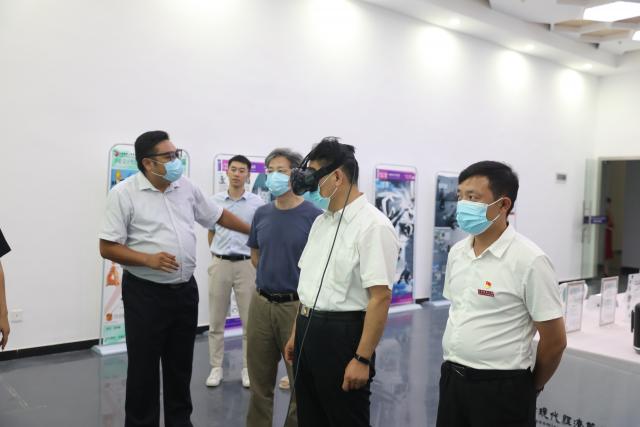 在VR展品区,王金海戴上VR眼镜,体验了展品。他还对展厅具体布置提出了一些建议和意见。