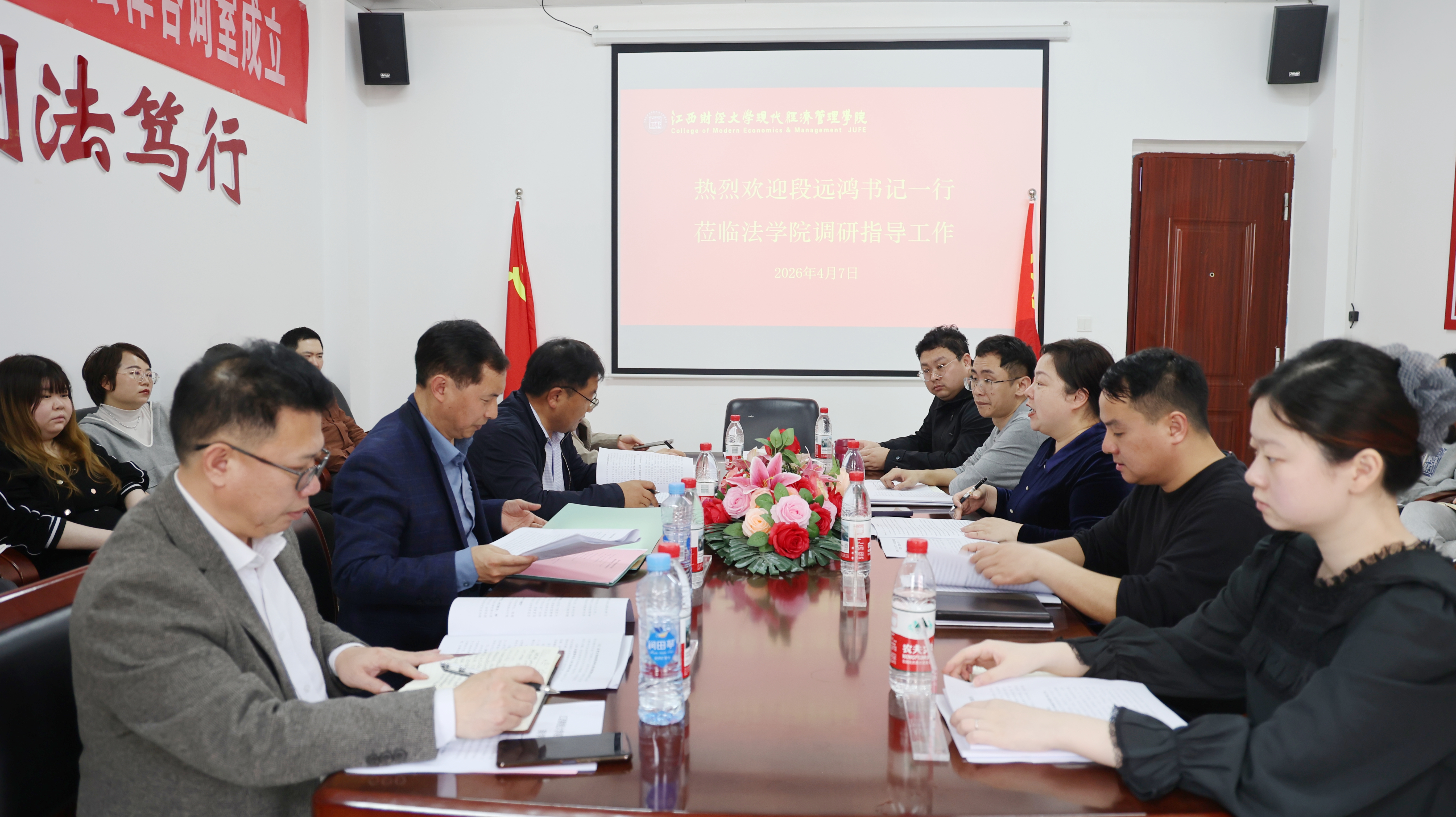 4月7日下午,学院党委书记段远鸿带队赴法学院调研指导工作,党政办主任吴合喜、党委学生工作处处长冯伟、人事处处长邓智陪同调研。
