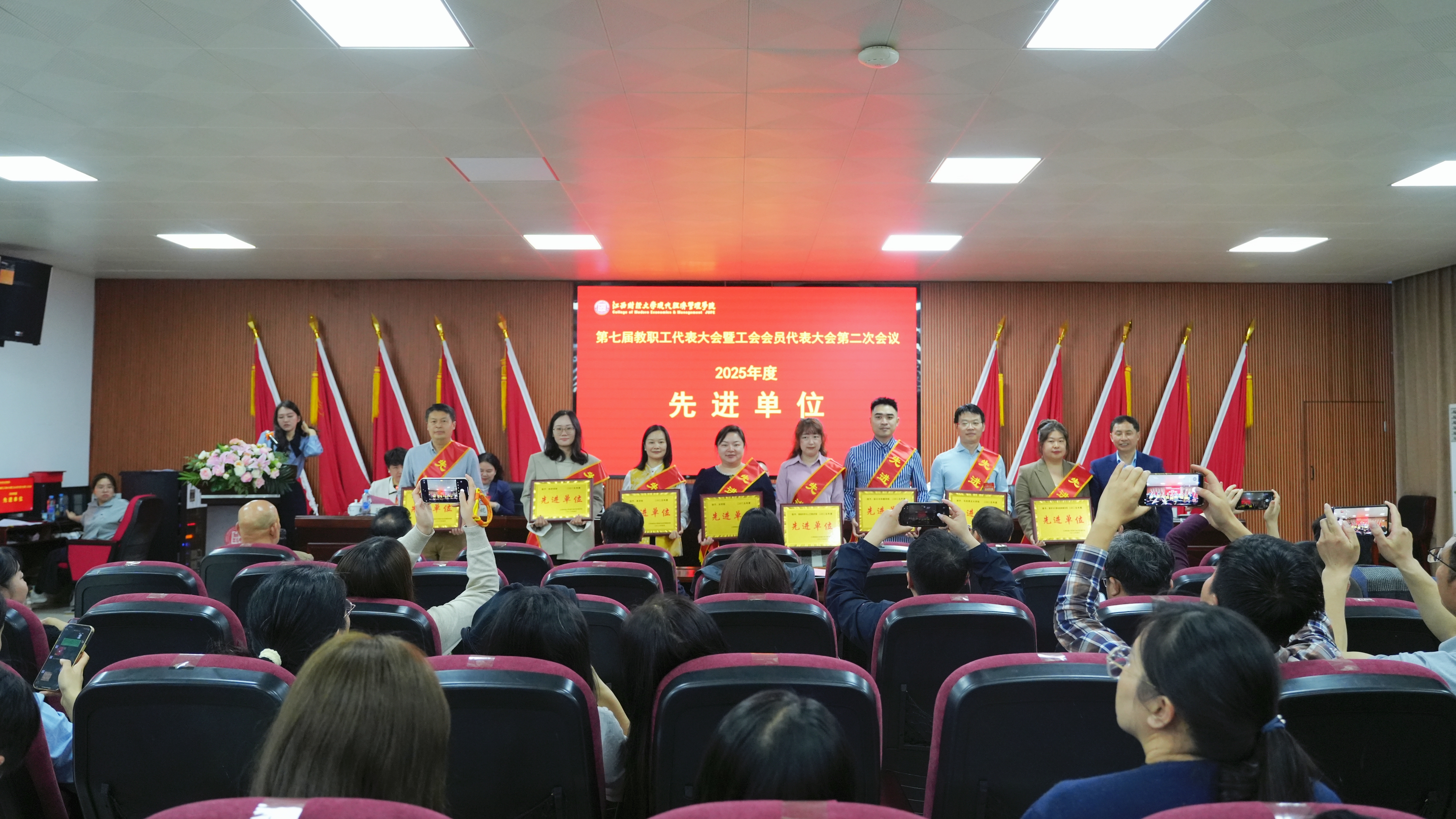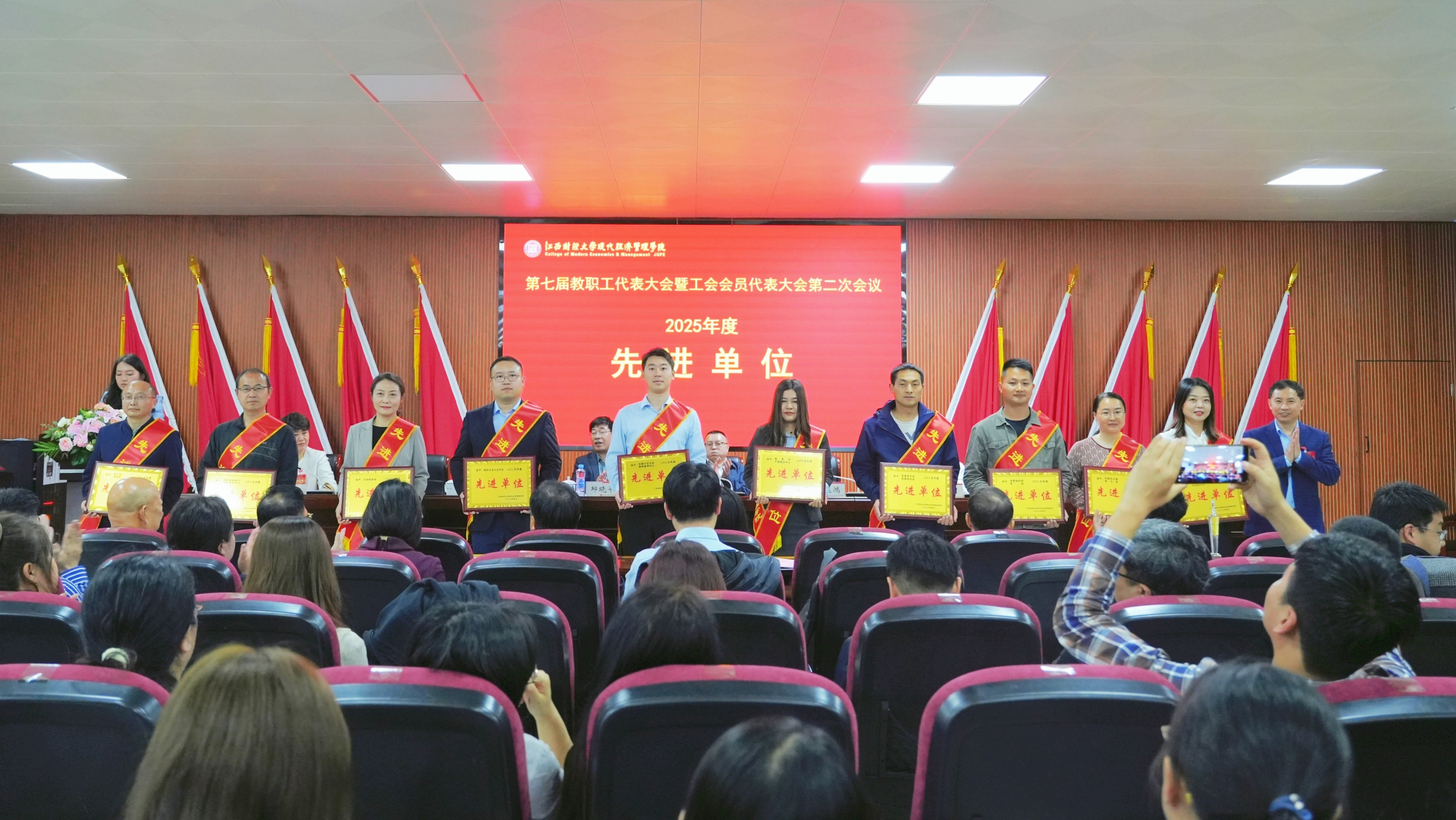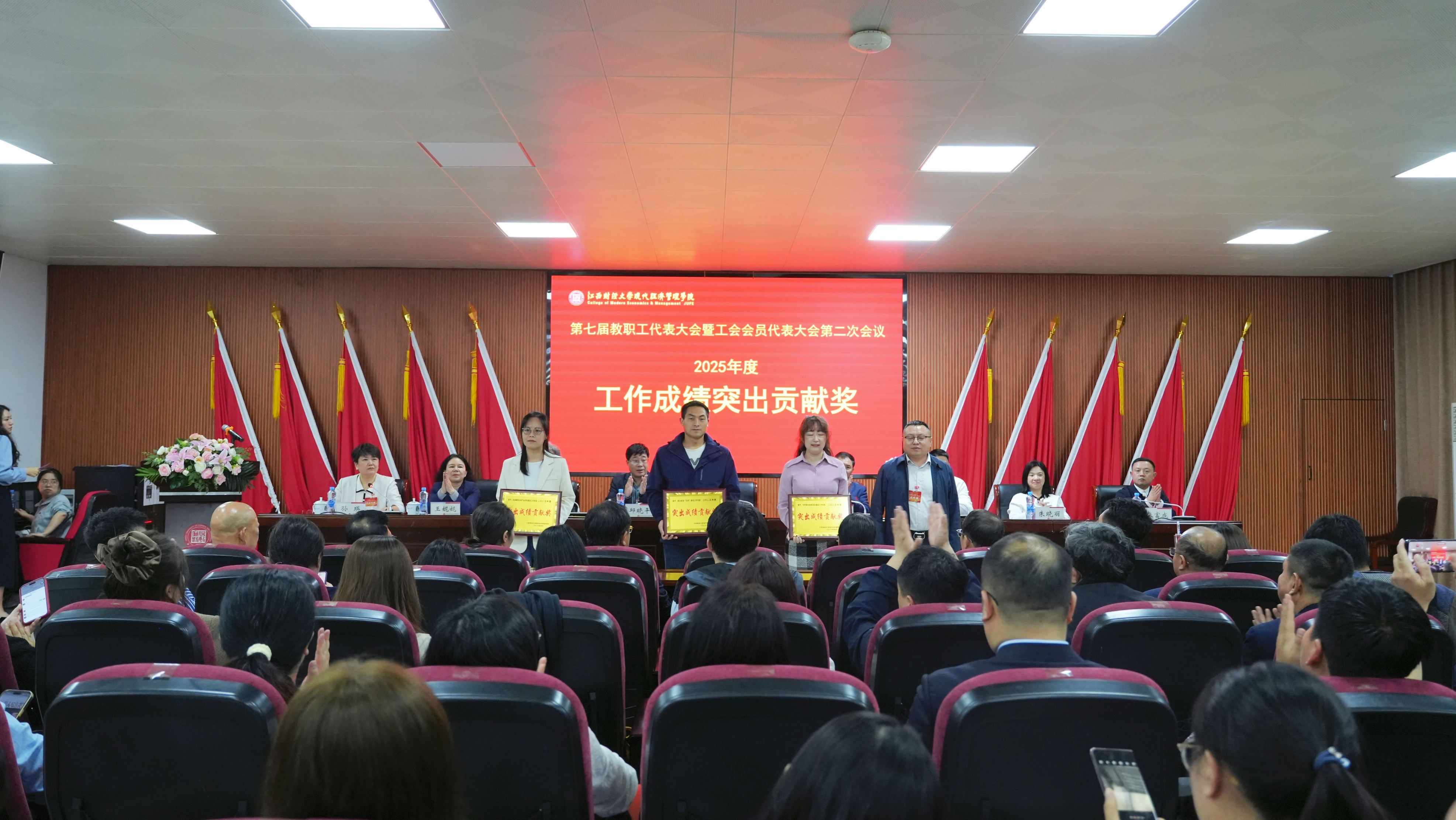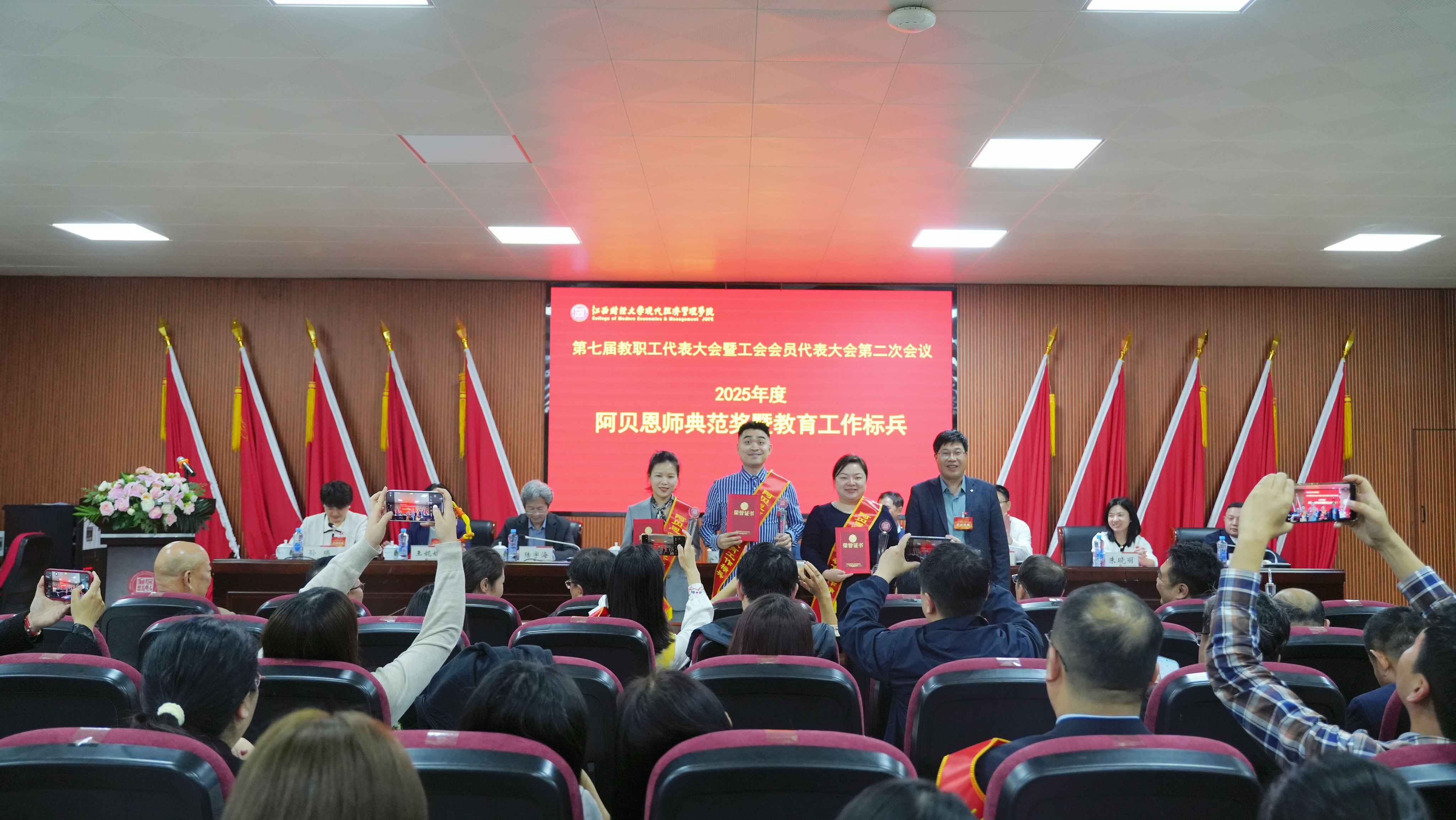 大会上表彰了2025年度先进单位、阿贝恩师典范奖、巾帼标兵、教学十佳、师德标兵、科研五强、信息化先进个人等各类先进集体和先进个人。在场院领导为获奖单位和个人颁奖。