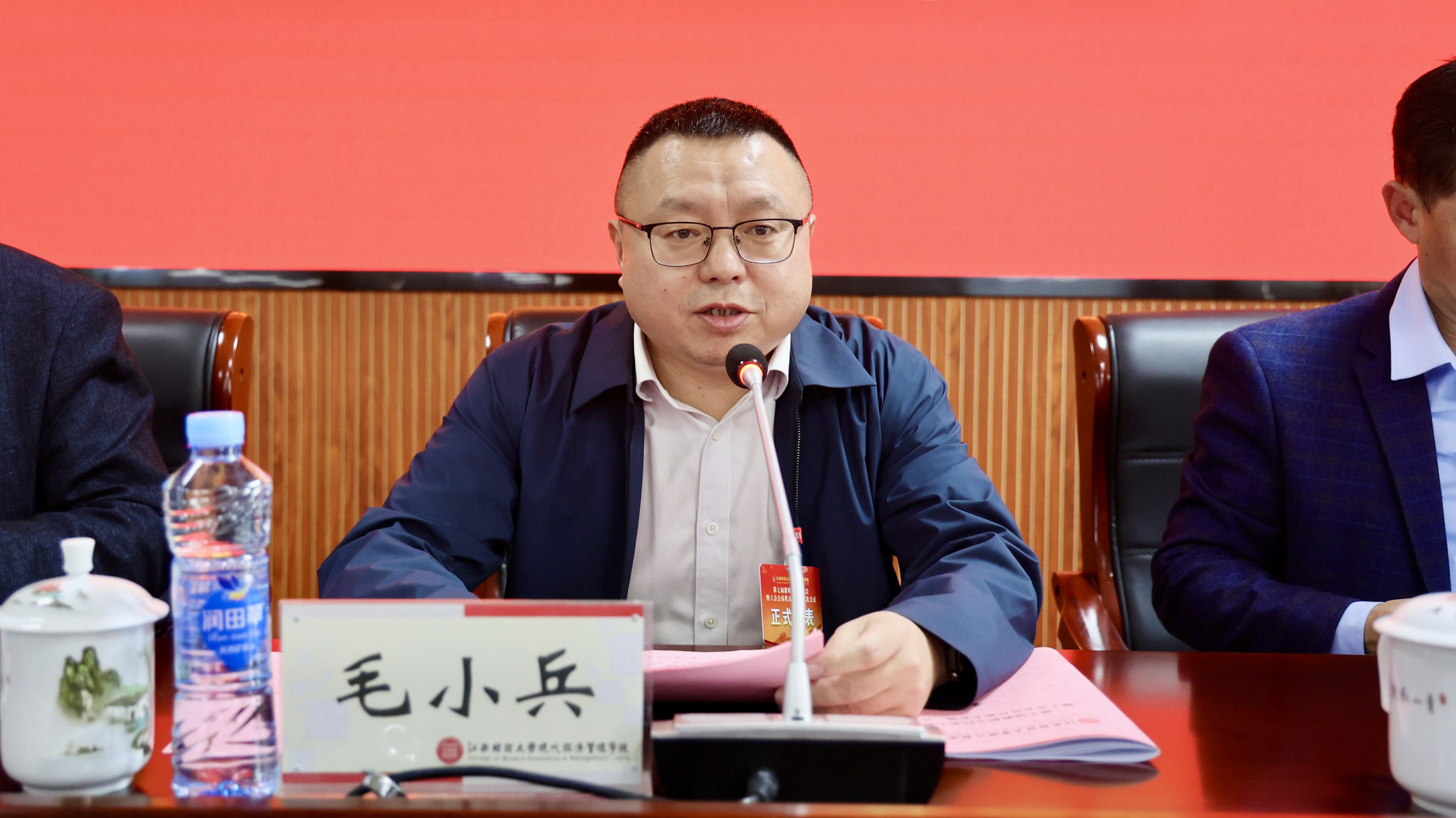 毛小兵在开幕式上作2025年工作报告。报告从铸牢党建思政根基,红色育人底色更加鲜明;深化教育教学改革,人才培养质量精准提升;推进产教深度融合,社会服务效能持续跃升;实施人才强校战略,师资队伍根基全面夯实;深耕校园文化建设,育人氛围活力竞相迸发;升级智慧校园建设,管理服务保障坚实有力;拓展国际合作交流,开放办学格局不断拓宽;聚力平安校园建设,校园治理效能稳步提升八个方面总结了学院2025年取得的工作成果。毛小兵从着力推进学院向高水平财经类应用型本科高校转型发展;着力提升人才培养质量;着力深挖国际化办学的内涵与外延;着力提升学院现代化治理水平四大方面展望了2026年学院各项工作。